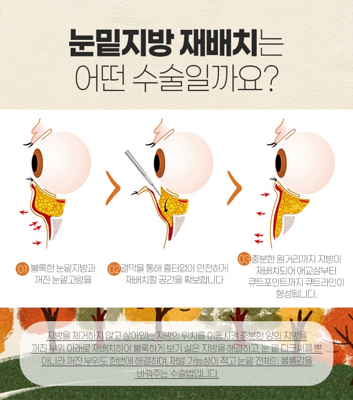이런 경우 단순히 눈밑지방을 제거하려 하거나 눈밑지방 재배치에 대해 알아보게 되는데요. 단순히 눈밑지방을 제거할 경우 충분히 효과를 보기 힘들며, 제거한다고 하더라도 다시 재발하는 경향이 있답니다.