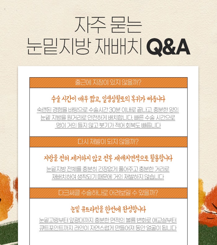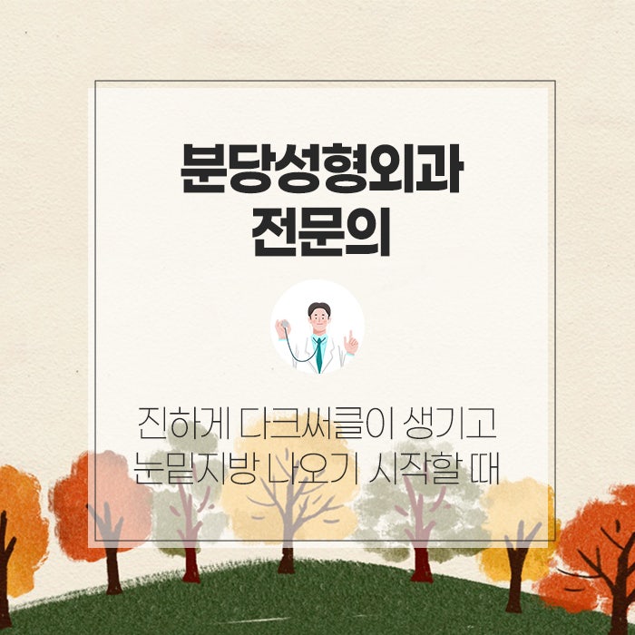 수술을 했는데 흉터가 심하게 남았거나 피부가 얼룩덜룩해서 고민하시는 분들이 많습니다. 또 보다 어려보이는 얼굴을 위해 눈밑지방 재배치를 받고자 분당성형외과 전문의를 찾으시는 경우가 많은데요.