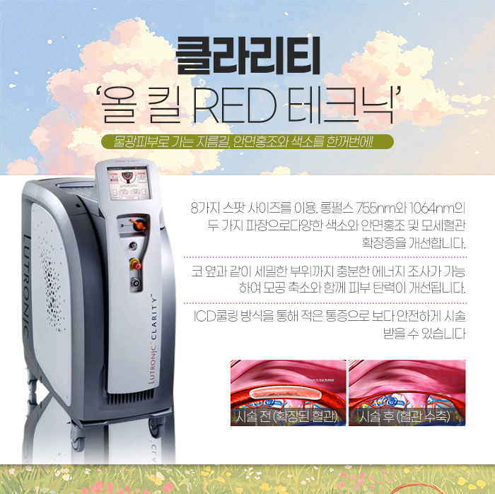 코 옆 같이 세밀한 부위에도 충분히 에너지를 조사하는 것이 가능한 만큼 모공을 축소시키면서 피부 탄력을 개선하는 데도 도움받을 수 있답니다. 또 ICD 쿨링 방식으로 진행되는 만큼 시술 시 느껴지는 통증이 적고 보다 안전하게 시술을 받아보실 수 있습니다.