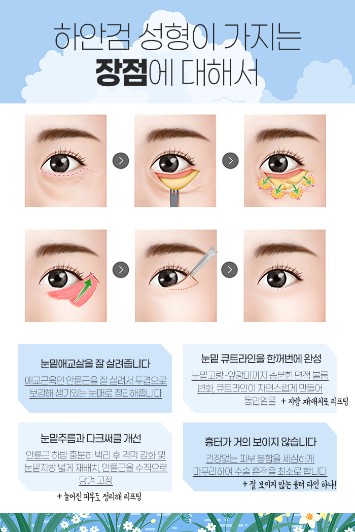 그리고 눈밑 노화가 심한 경우에는 분당눈성형으로 하안검수술을 진행하게 되는데요. 하안검수술은 불룩한 지방을 눈밑고랑 아래로 재배치해서 개선하는데 도움을 주고, 늘어진 안륜근을 리프팅하면서 애교살을 좁고 도톰하게 살려주어 인상을 생기있게 만드는데 도움을 주는 수술이랍니다.