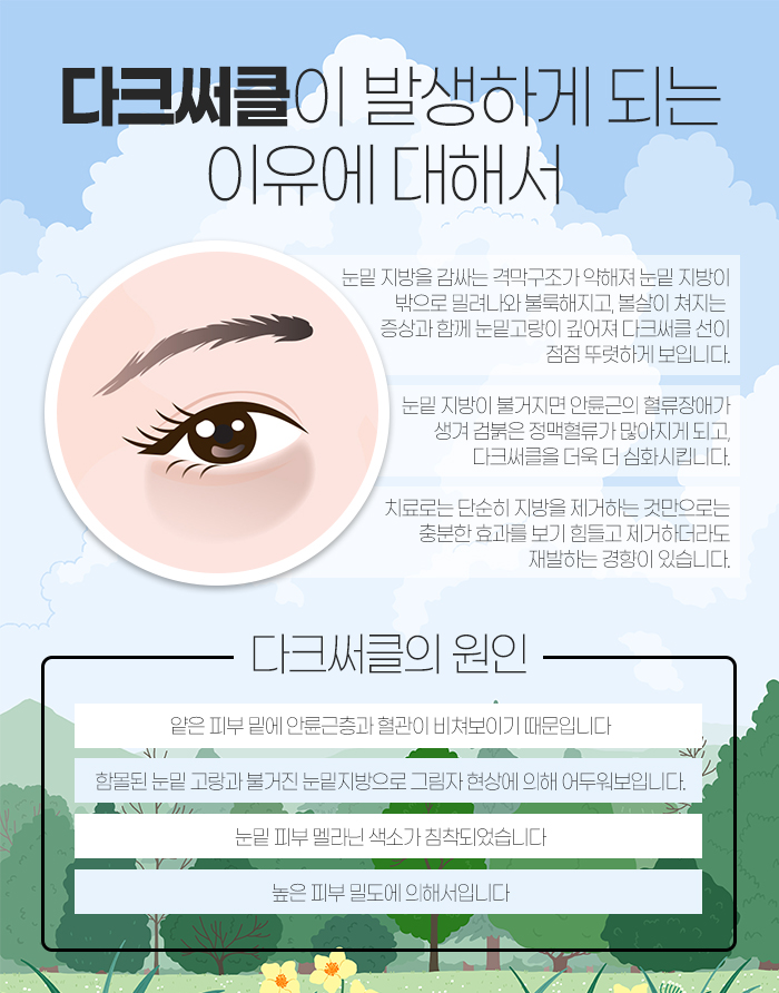 이 외에도 여러 가지 이유로 다크써클이 발생하게 되지만 보통 눈밑 노화로 인해 나타나게 되는 경우가 많은데요. 이런 경우 단순히 처진 눈밑지방을 제거하는 것으로는 충분히 효과를 보기 힘들답니다. 또 제거한다고 하더라도 다시 재발하는 경향이 있는데요.