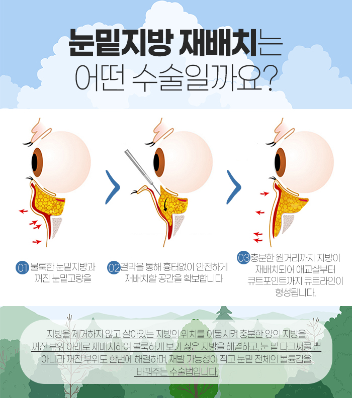 또 숙련된 의료진에게 재배치를 받아야 하는 이유는 수술 난이도에 있는데요. 먼저 수술 방식에 대해 말하자면 결막 아래 충분한 공간을 확보한 다음 불룩한 부분의 지방을 충분히 원거리까지 재배치해주어야 한답니다. 그래야 불룩하게 보기 싫은 지방도 개선되고, 꺼진 부위도 충분한 양의 지방이 재배채되면서 볼륨이 증강되어 다크써클도 나아지는 것인데요.