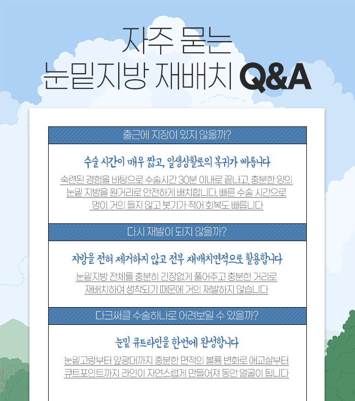 이런 경우 분당눈성형로 눈밑지방 재배치를 진행하게 되면 지방을 제거하지 않고 살아있는 지방의 위치를 이동시키는 것을 통해 충분한 양의 지방을 꺼진 부위 아래로 재배치하여 불룩하게 보기 싫은 지방을 개선하는데 도움 받을 수 있습니다. 또 꺼진 부위도 한번에 개선하는데 도움 받을 수 있는데요. 그래서 수술 후 재발 가능성이 적으며, 눈밑 전체의 볼륨감을 바꿔주는 데도 도움 받을 수 있답니다.