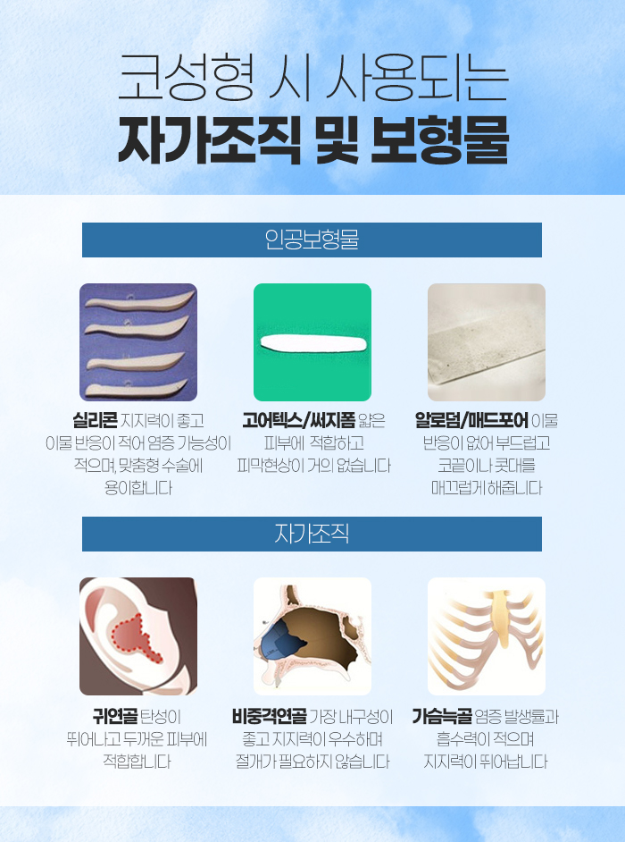 그리고 분당코성형 시 사용되는 보형물에는 귀연골, 가슴늑골, 비중격 연골이 있는데요. 귀연골의 경우 소프트하고 잘 구부러지는 성질이 있고, 가슴늑골의 경우 굵고 단단해서 코 재건 성형에 적합하답니다. 또 비중격 연골은 책받짐처럼 얇고 빳빳해서 가공하며 다루기 좋은데요. 콧망울 연골 구조를 지지하거나 콧망울 모양을 변형 및 강화하는데 적합하답니다.