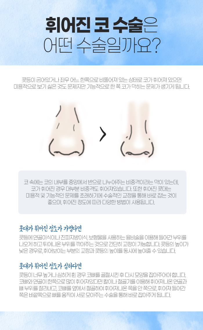 하지만 보형물 문제가 아니라 선천적으로 휘어진 경우라면 휘어진 정도가 가벼운 경우 콧등에 융비술로 들어간 부위를 나오게 하고, 튀어나온 부위를 깎아주는 것을 통해 간단히 교정하는 게 가능하답니다. 하지만 휘어진 정도가 심하다면 코뼈를 골절시킨 다음 다시 모양을 잡아줍니다. 칼이나 절골기로 휘어져 나온 연골, 뼈 부위 잘라내고 코뼈 옆에서 절골해 휘어져 나온 쪽을 안쪽으로 움직이고 휘어져 들어간 쪽을 바깥 쪽으로 움직여서 바로 잡아줍니다.
