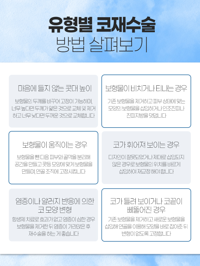우선 재수술에 대해 알아보는 경우 콧대의 높이가 마음에 들지 않거나 보형물이 비치거나 티가 나서, 보형물이 움직여서, 코가 휘어져 보여서, 염증이나 알러지 반응으로 코 모양이 변형돼서, 코가 들려 보이거나 코끝이 삐뚤어져서입니다.