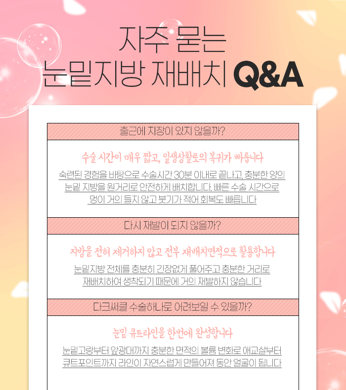 그래서 눈밑지방재배치멍 통증 등에 대해 걱정하며 눈밑지방 재배치를 통해 도움받고자 하시는 경우가 많은데요. 이는 지방을 제거하지 않고 살아있는 지방의 위치를 이동시켜서 충분한 양의 지방을 꺼진 부위 아래로 재배치하는 것을 통해 불룩하게 보기 싫은 지방을 개선하는데 도움을 주고, 눈밑 다크써클 외에도 꺼진 부위도 한번에 개선하는데 도움을 주어서입니다. 그래서 재발 가능성이 적고, 눈밑 전체의 볼륨감을 바꿔주기도 하지만